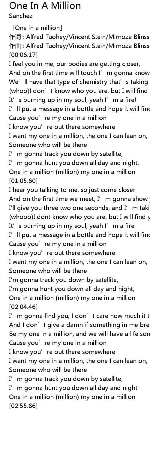 | [00:43.39] | I want my one in a million, the one I can lean on, |