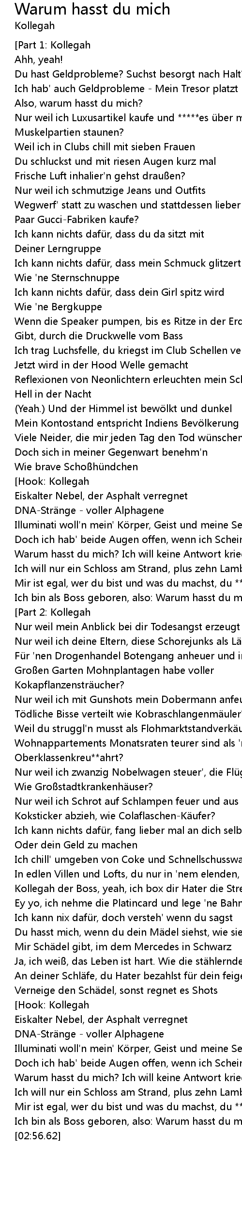 | [02:19.91] | Kollegah der Boss, yeah, ich box dir Hater die Streberbrille vom Kopf |