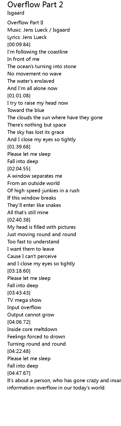 | [05:00.00] | It's about a person, who has gone crazy and insane by the constant information-overflow in our today's world. |