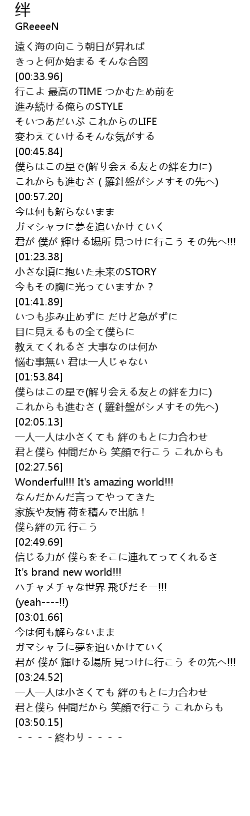 | [03:24.82] | 一人一人は小さくても 絆のもとに力合わせ |