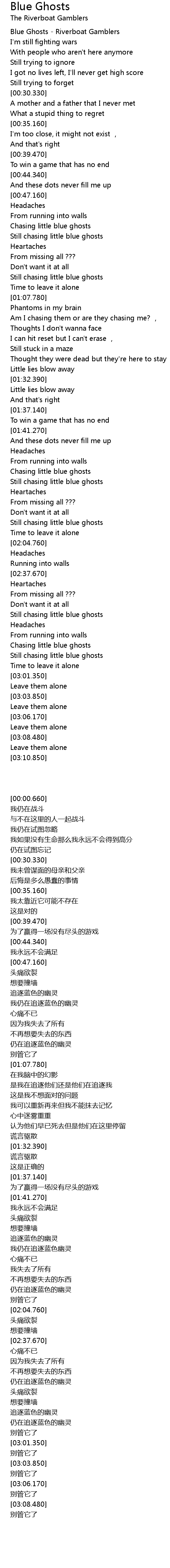 | [01:03.970] | Still chasing little blue ghosts |
