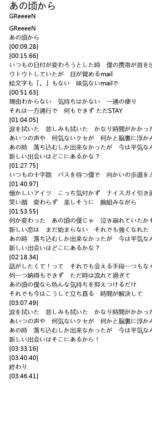 | [03:13.53] | あいつの声や 何気ないクセが 何かと脳裏に浮かんだ |