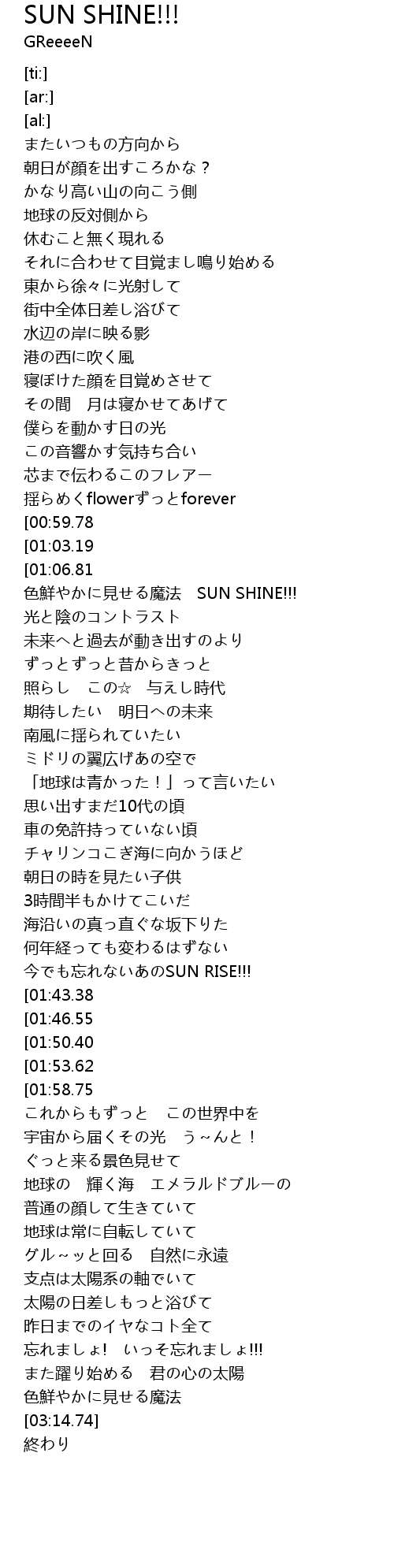 | [03:06.47][01:53.62] | 希望持たせてくれるだろう SUN SHINE!!! |