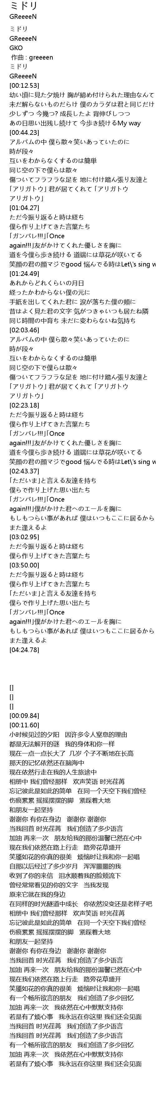 | [00:59.38] | 「アリガトウ」 君が居てくれて 「アリガトウ アリガトウ」 |