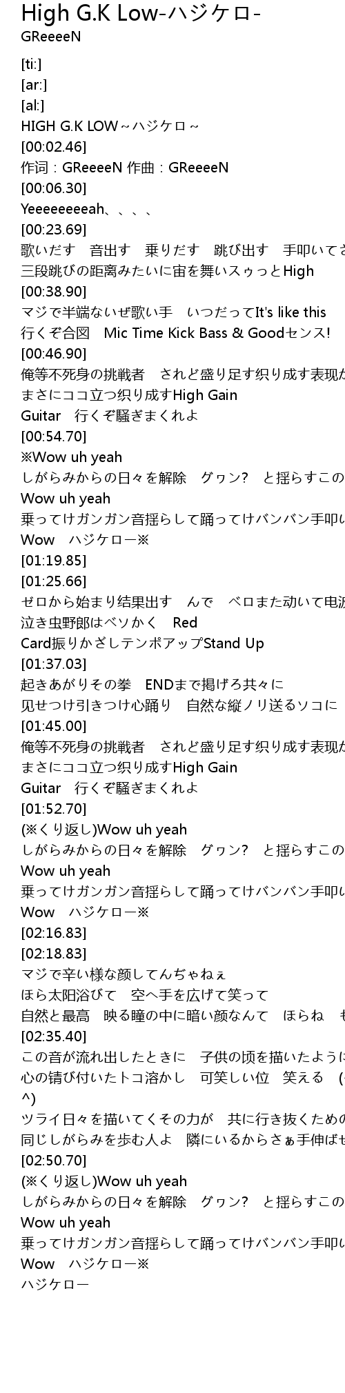 | [00:00.00] | HIGH G.K LOW~ハジケロ~ |