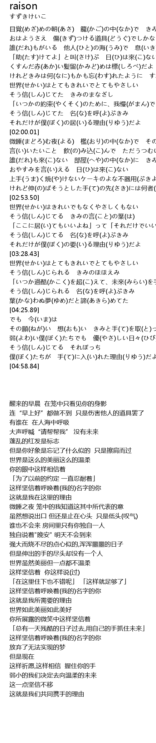 | [03:20.86] | それだけが僕(ぼく)の要(い)る理由(りゆう)だよ |