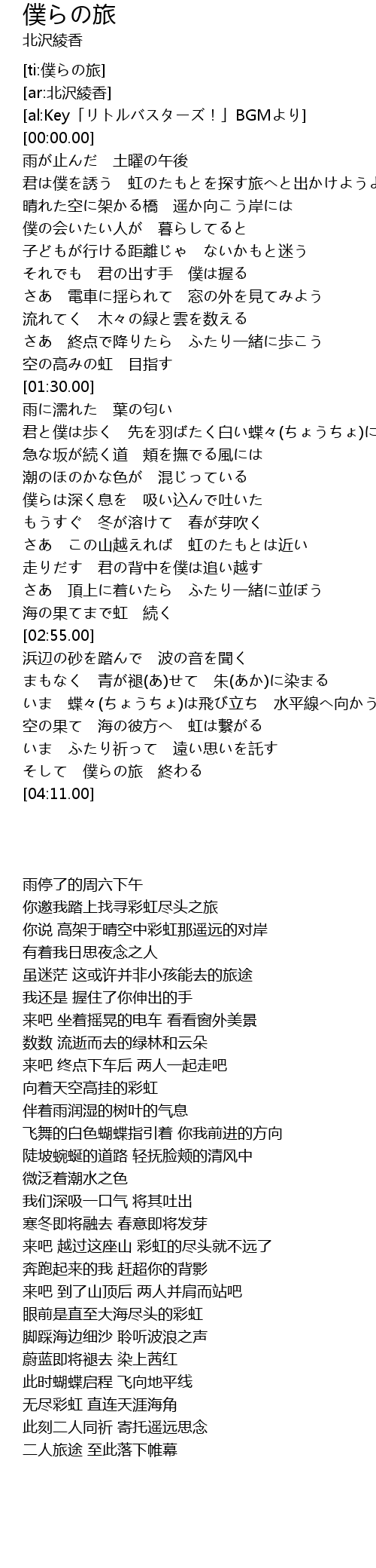 | [00:19.00] | 君は僕を誘う 虹のたもとを探す旅へと出かけようよ |