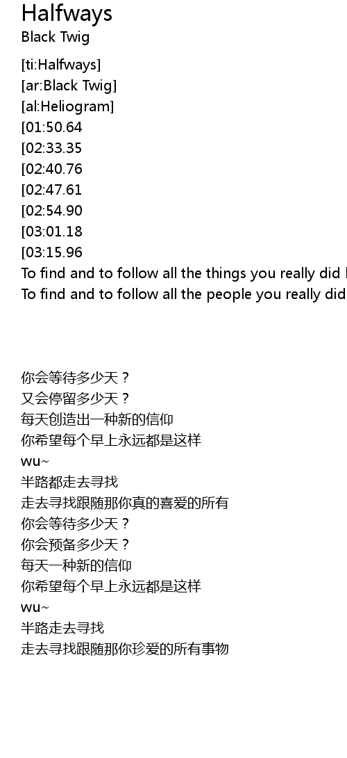 | [01:35.69][03:15.96] | To find and to follow all the halfways |