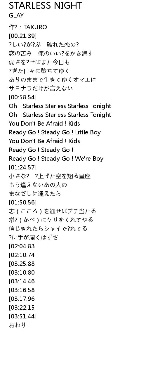 | [02:57.00][02:04.83] | Oh Starless Starless Starless Tonight |