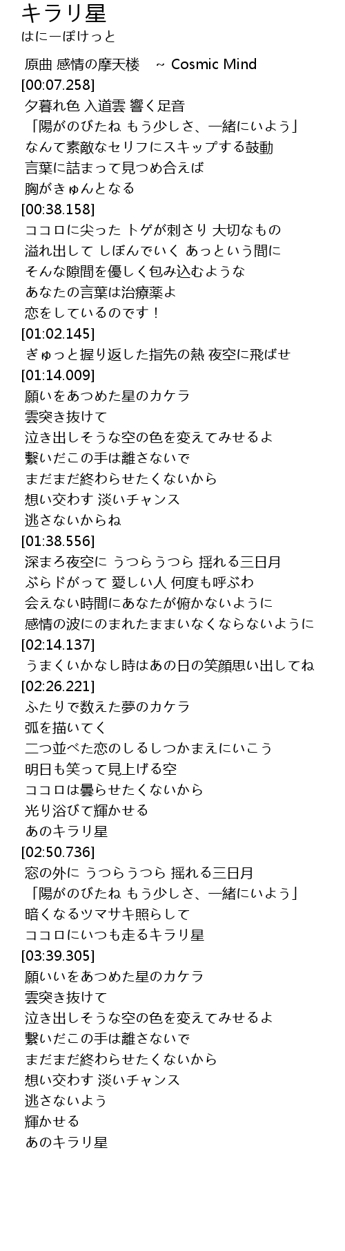 | [03:33.662] | ココロにいつも走るキラリ星 |