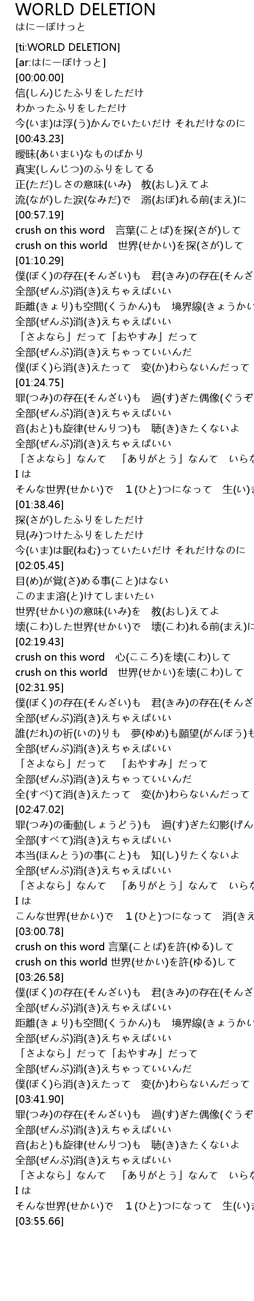 | [02:43.61] | 全(すべ)て消(き)えたって 変(か)わらないんだって この世界(せかい)は |