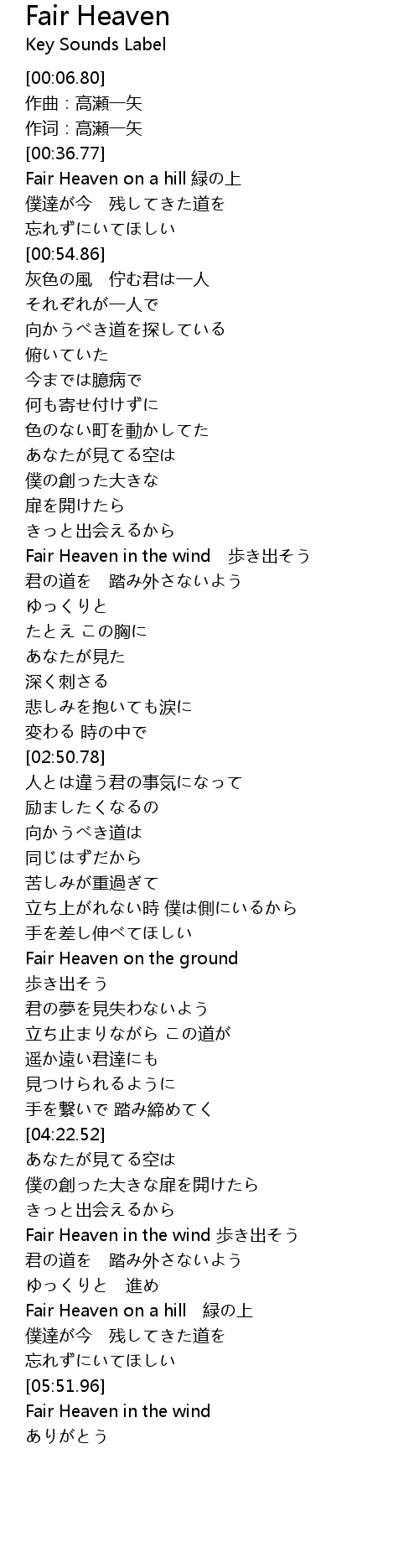 | [00:38.10] | Fair Heaven on a hill 緑の上 |
