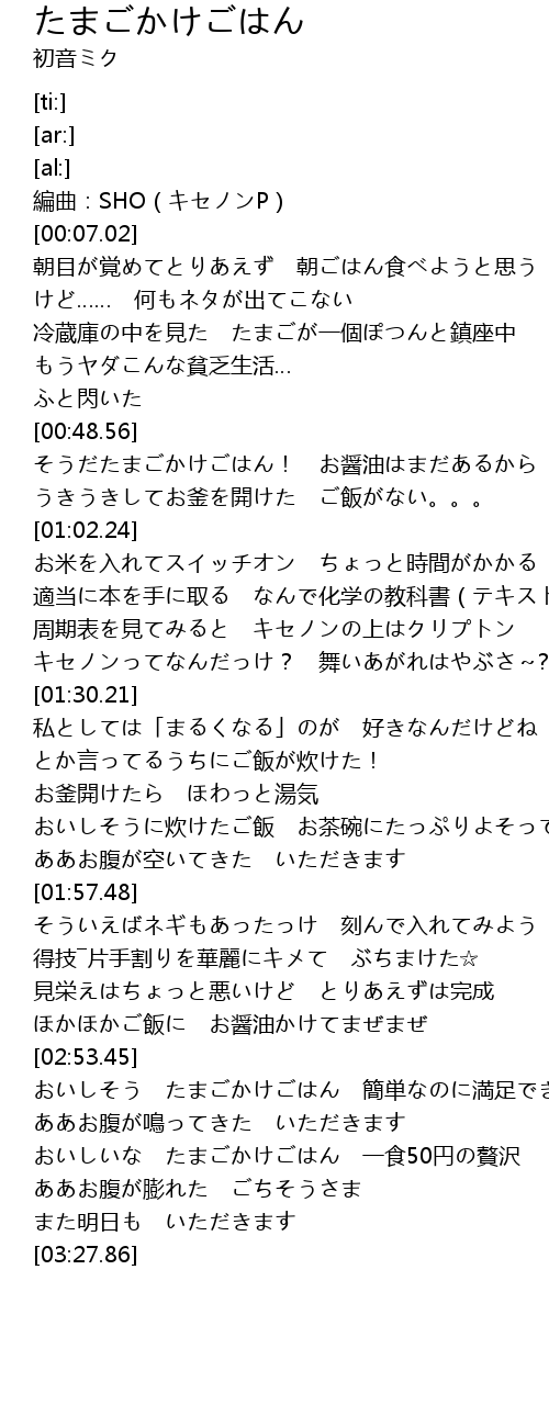 | [03:07.78] | おいしいな たまごかけごはん 一食50円の贅沢 |