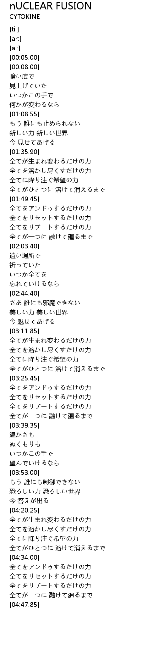 | [01:46.00] | 全てがひとつに 溶けて消えるまで |