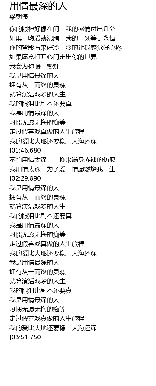 | [01:24.460] | wǒ shì yòng qíng zuì shēn de rén |