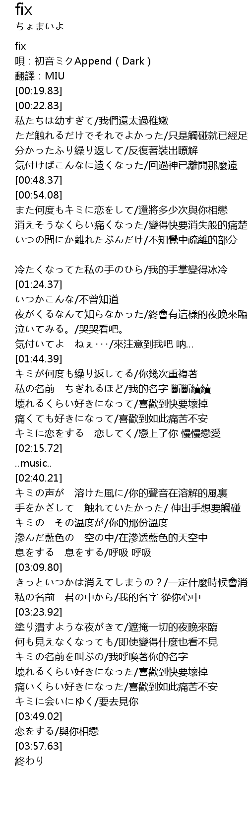 | [00:14.22] | 唄:初音ミクAppend(Dark) |
