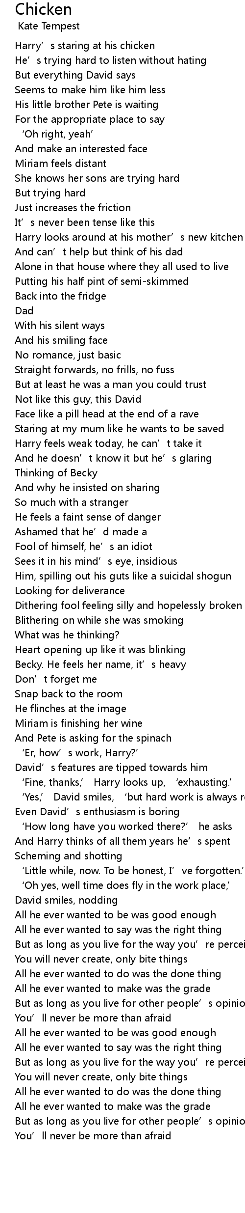 | [00:04.79] | Harry' s staring at his chicken |