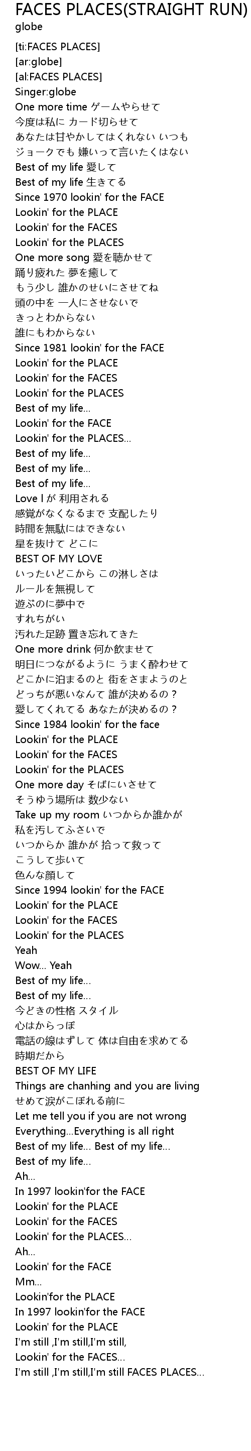 | [05:54.79] | I'm still ,I'm still,I'm still FACES PLACES… |