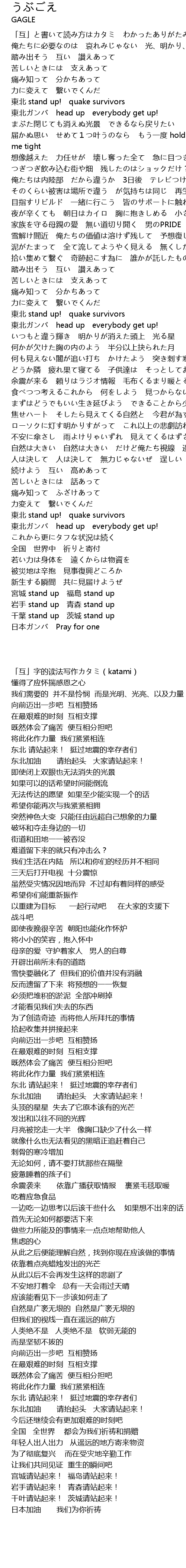 | [03:24.29] | 東北 stand up! quake survivors |