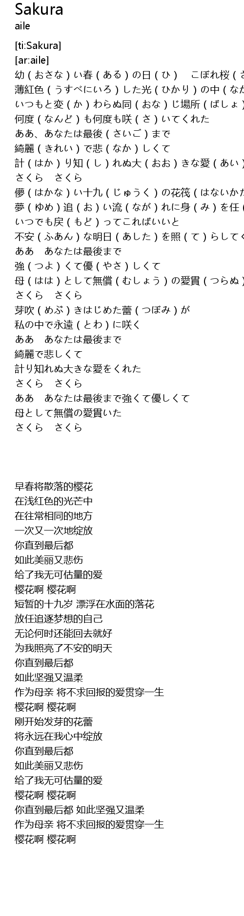 | [00:14.85] | 幼(おさな)い春(ある)の日(ひ) こぼれ桜(ざくら) |