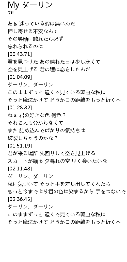 | [02:01.91] | スカートが踊る 夕暮れの空 早く会いたいな |