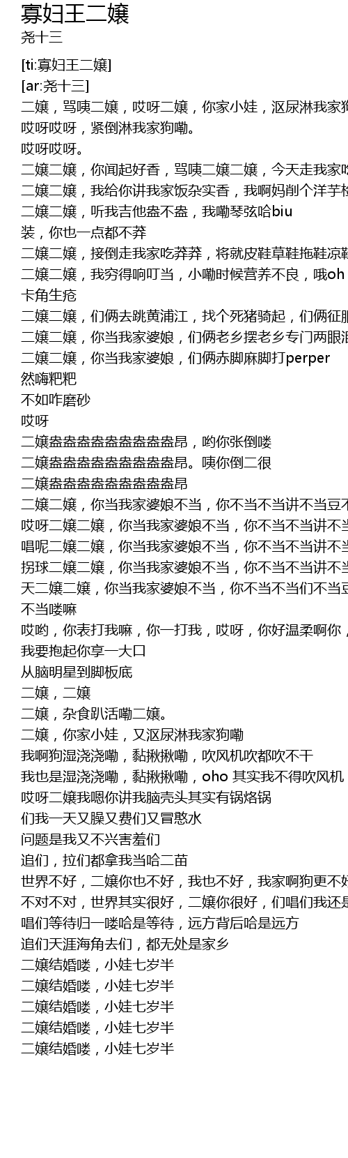 | [01:17.938] | 二嬢二嬢,你当我家婆娘,们俩赤脚麻脚打perper 然嗨粑粑 |