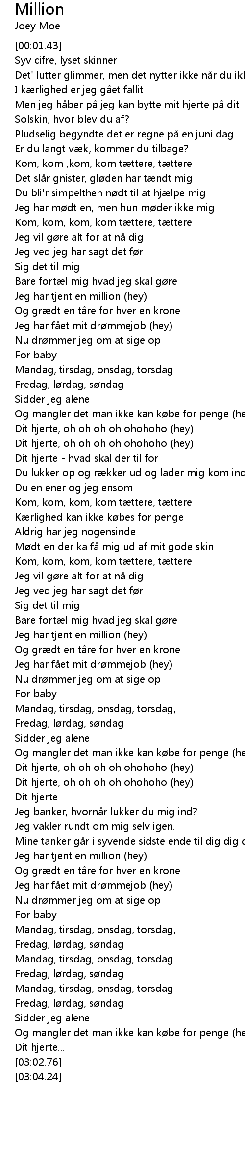 | [00:39.22] | Jeg har tjent en million (hey) |