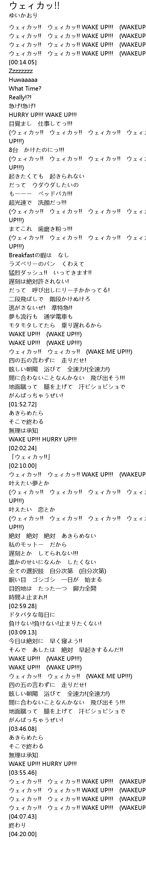 | [03:58.72] | ウェィカッ!! ウェィカッ!! WAKE UP!!! (WAKEUP!!!) |