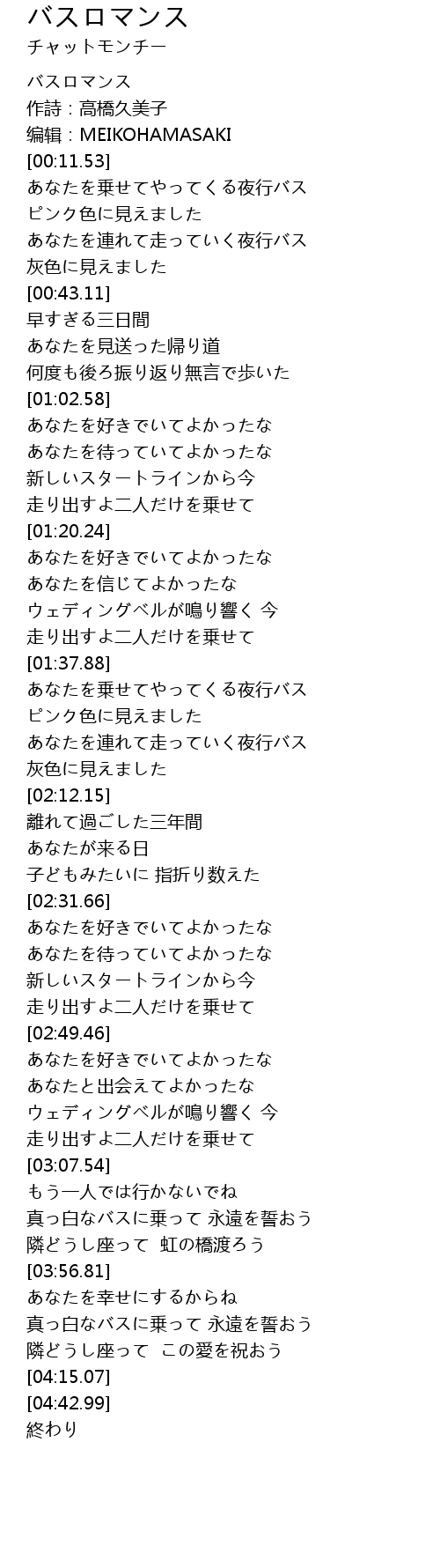 | [04:01.50] | 真っ白なバスに乗って 永遠を誓おう |