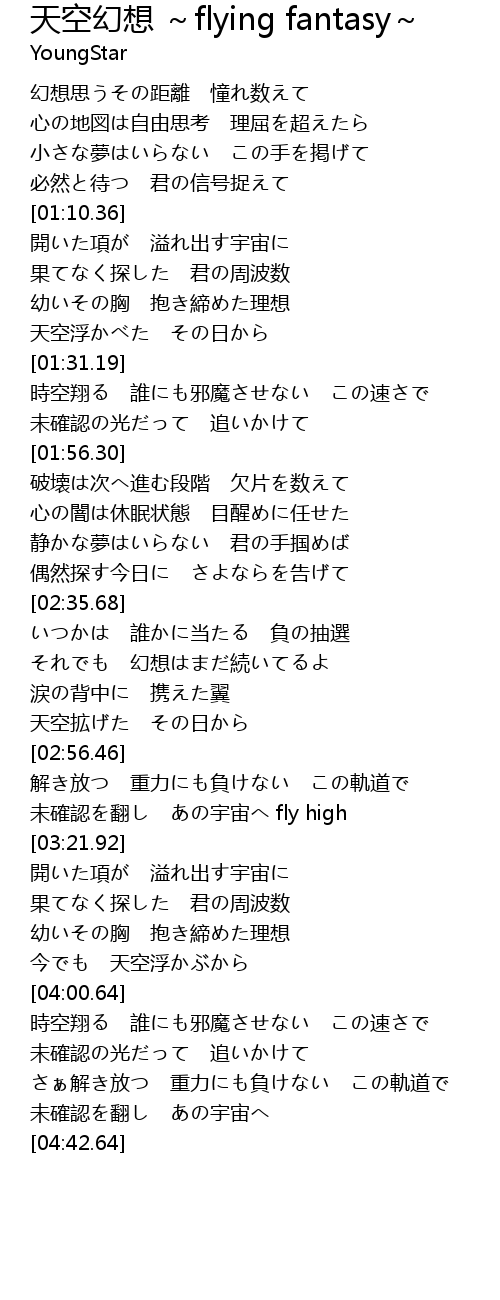 | [03:06.65] | 未確認を翻し あの宇宙へ fly high |
