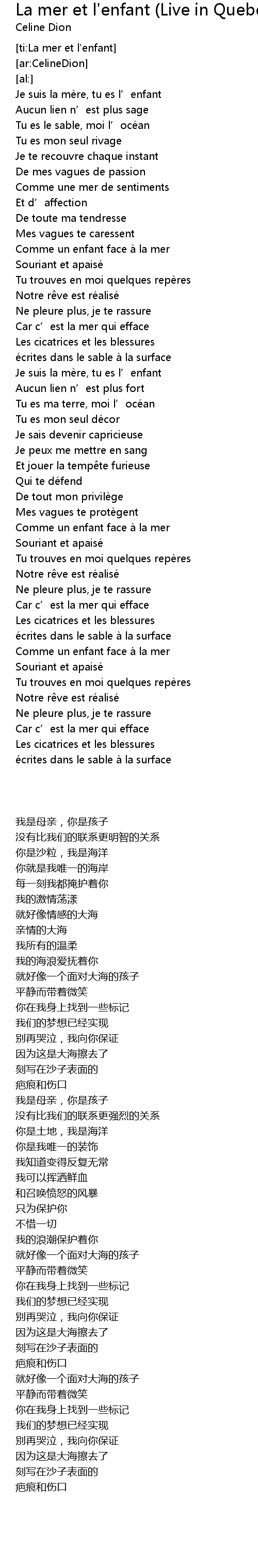 | [00:15.43] | Je suis la mè re, tu es l' enfant |