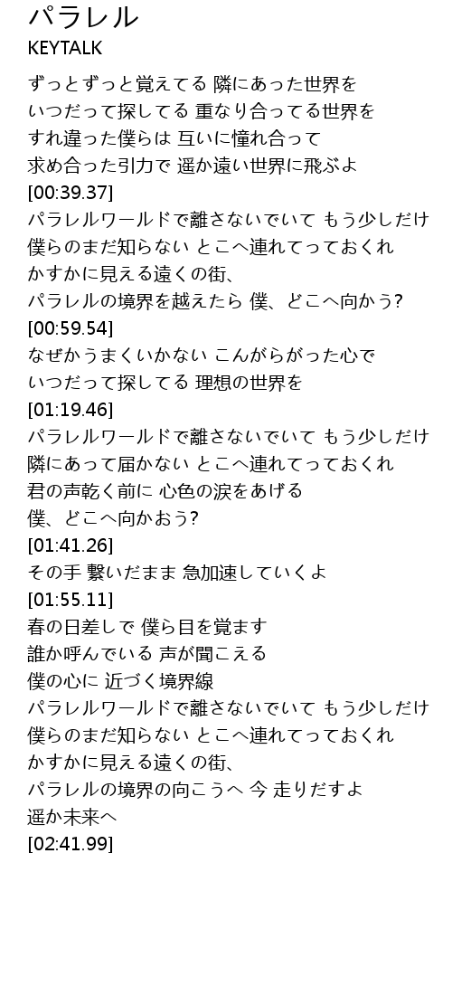 | [00:39.80] | パラレルワールドで離さないでいて もう少しだけ |