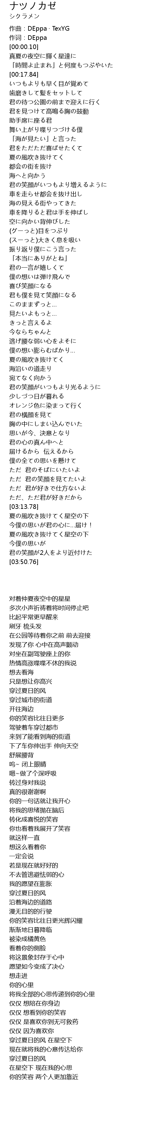 | [03:32.39] | 夏の風吹き抜けてく星空の下 |