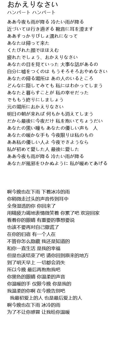 | [01:04.91] | くたびれた顔でほほえむ 疲れたでしょう、おかえりなさい |