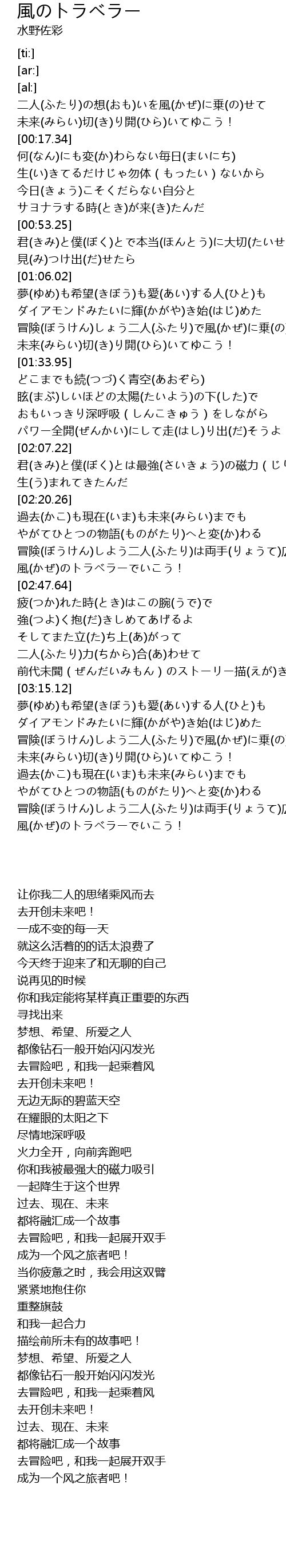 | [04:01.00] | 風(かぜ)のトラベラーでいこう! |