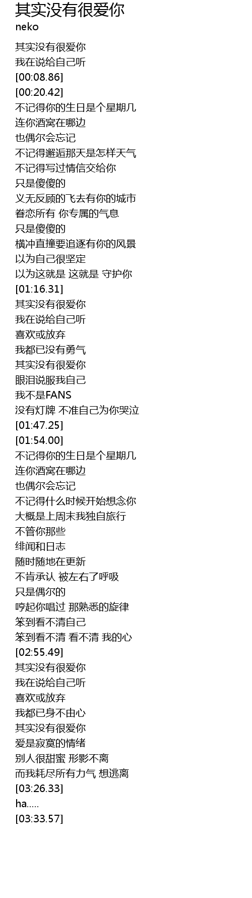 | [01:33.75] | qí shí méi yǒu hěn ài nǐ |