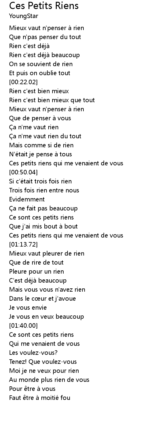 | [00:46.00] | Ces petits riens qui me venaient de vous |