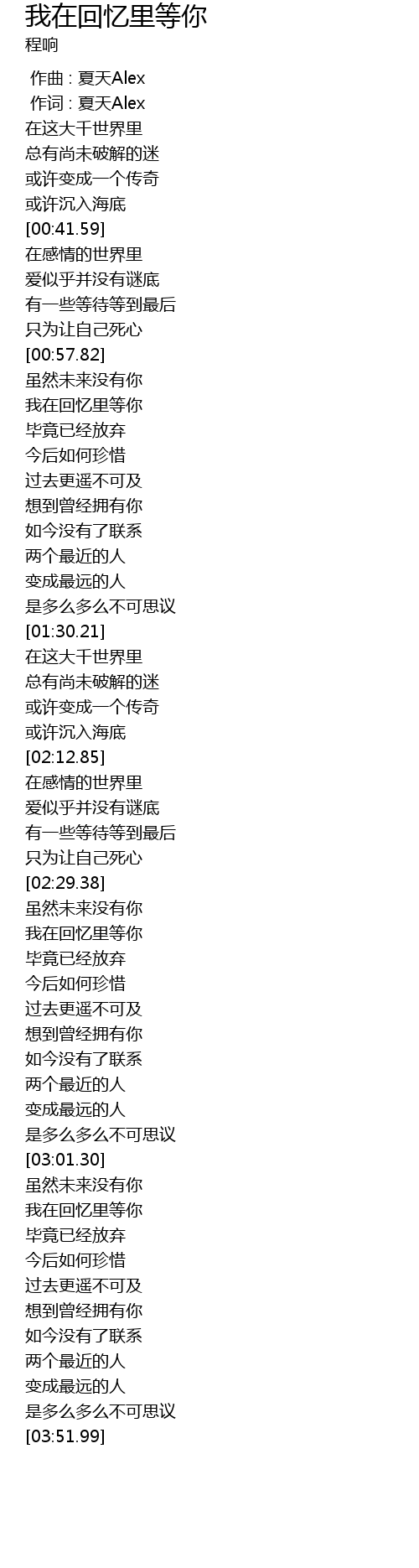 | [03:24.71] | wǒ zài huí yì lǐ děng nǐ |