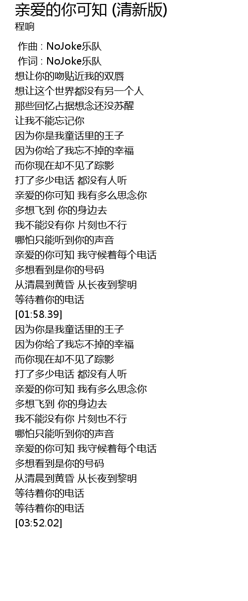 | [03:16.88] | 亲爱的你可知 我守候着每个电话 |