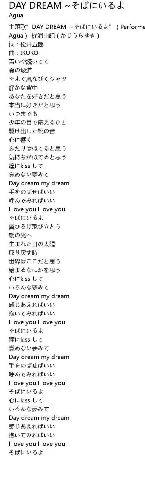 | [00:00.500] | 主題歌”DAY DREAM ~そばにいるよ”(Performed by Agua)-梶浦由記(かじうらゆき) |