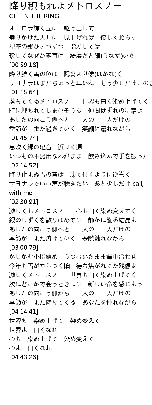| [01:16.21] | 落ちてくるメトロスノー 世界も白く染め上げてく |