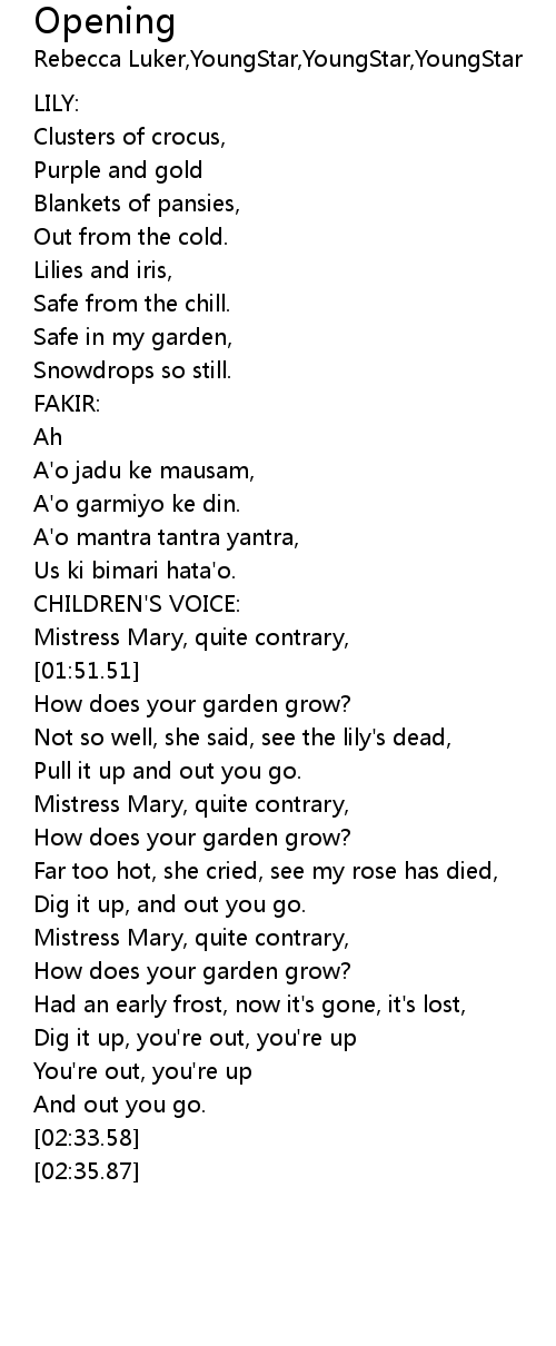 | [02:18.49] | Mistress Mary, quite contrary, |