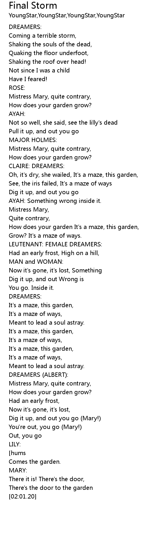 | [01:20.22] | Dig it up, and out you go (Mary!) |