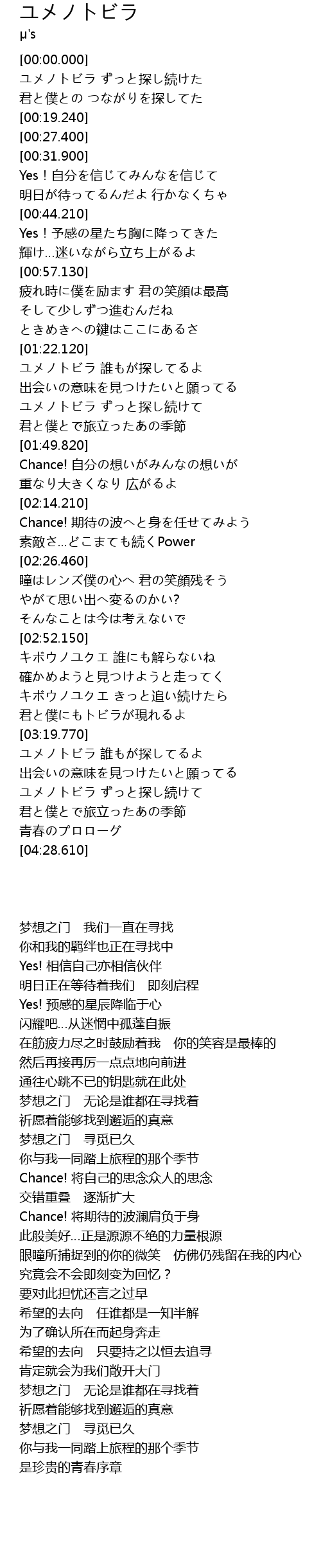 | [01:35.300] | ユメノトビラ ずっと探し続けて |