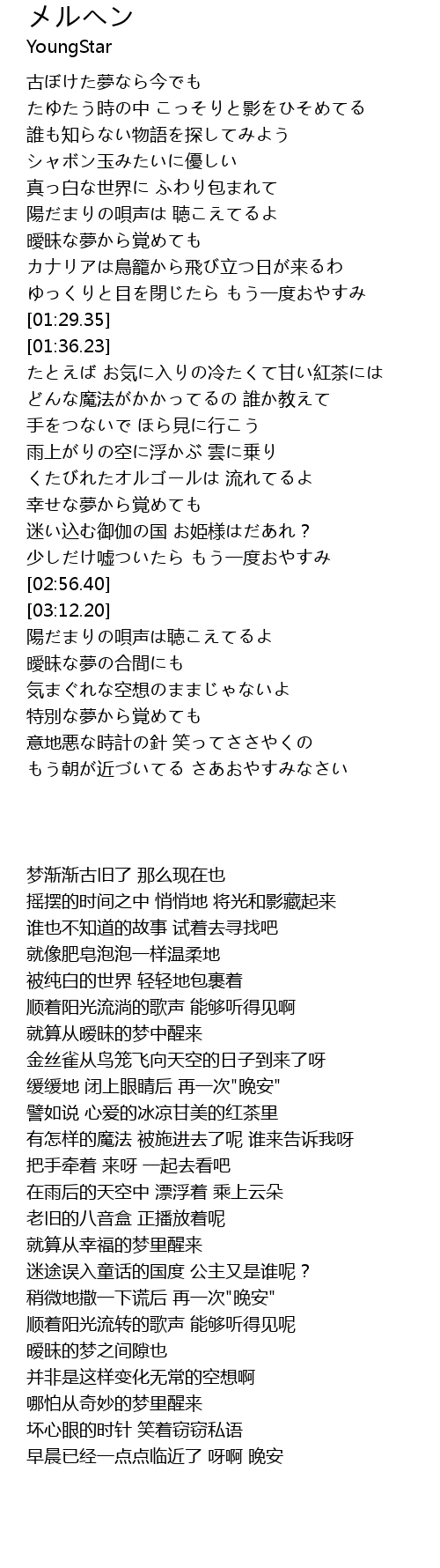 | [04:00.20] | もう朝が近づいてる さあおやすみなさい |
