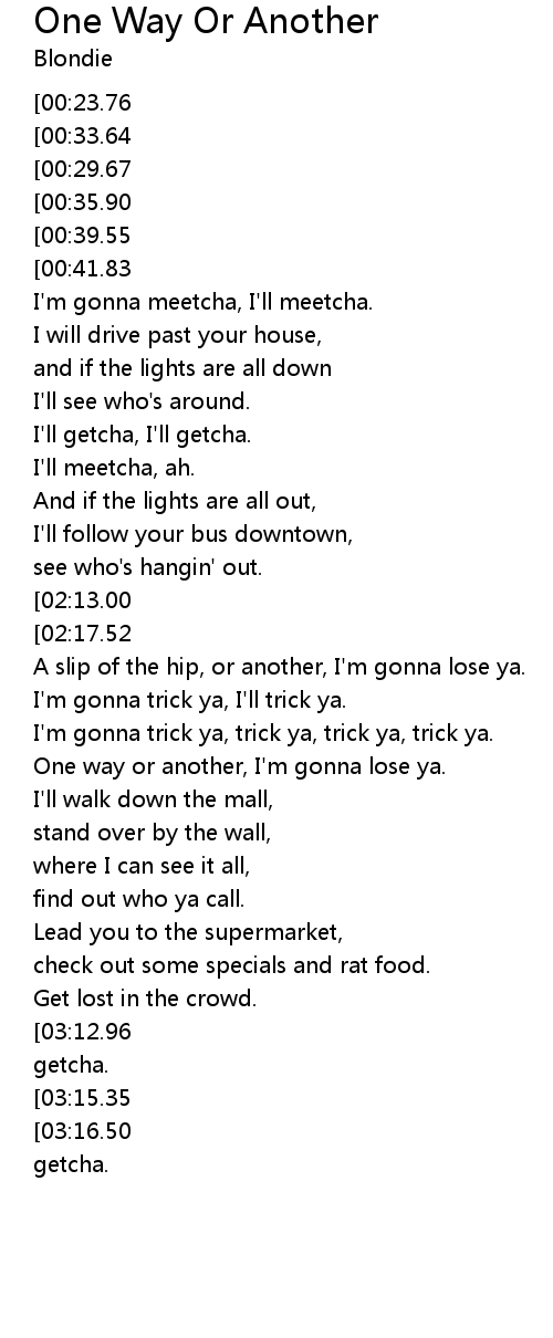[03:18.26][03:12.96][03:07.00][03:00.91][02:55.11] One way or another, I'm gonna getcha.