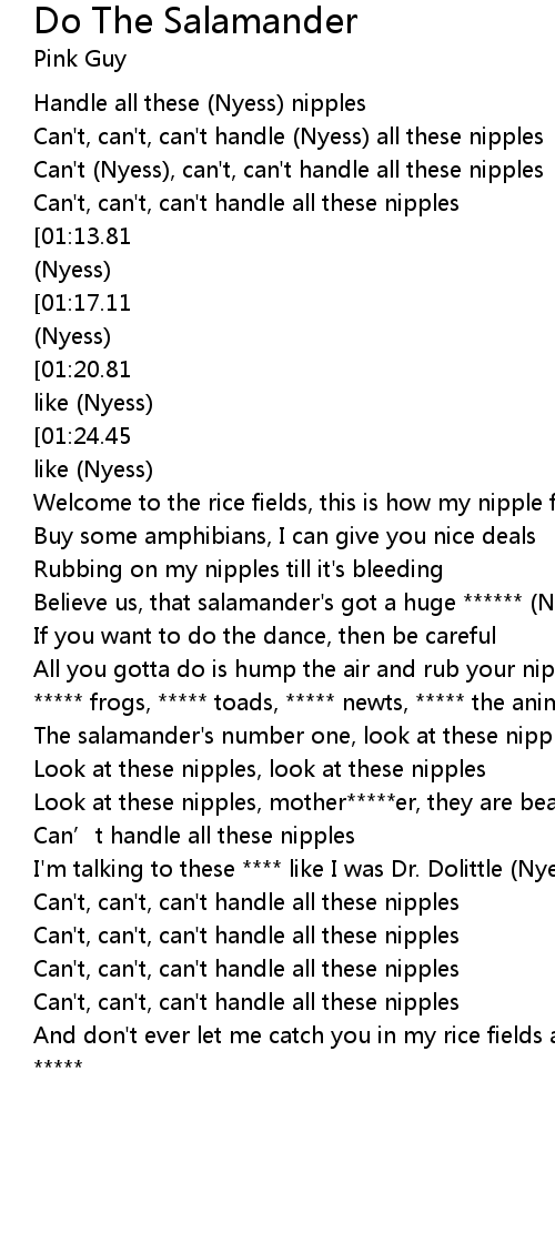 | [01:28.63][01:13.81][00:14.82] | Now do the salamander Nyess, do the salamander Nyess |