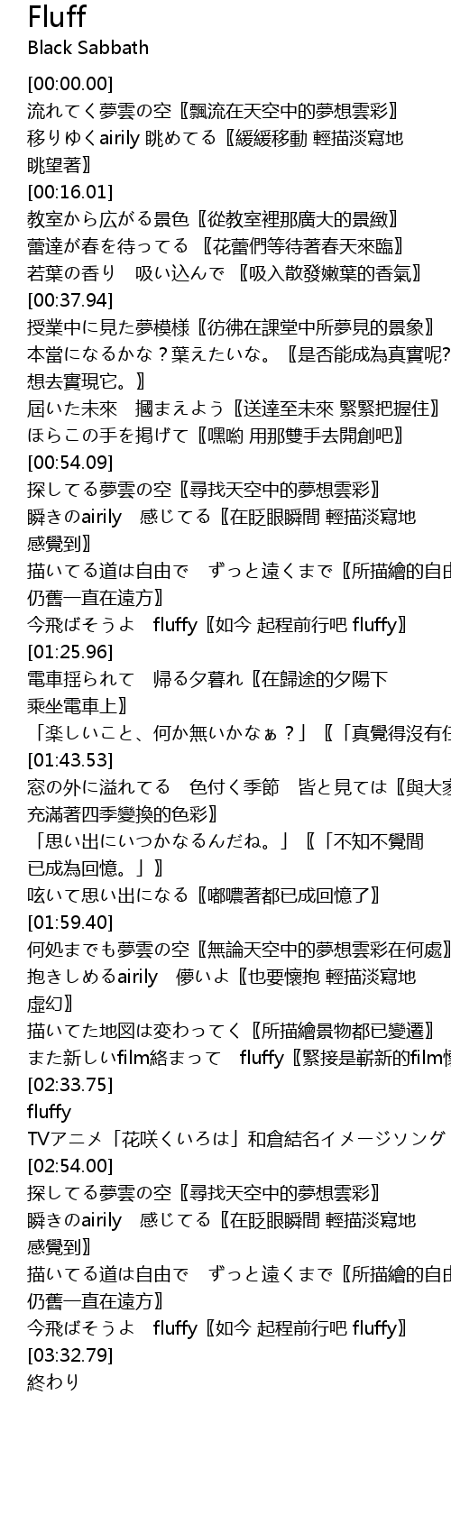 | [02:18.04] | また新しいfilm絡まって fluffy〖緊接是嶄新的film懷抱我們是fluffy〗 |