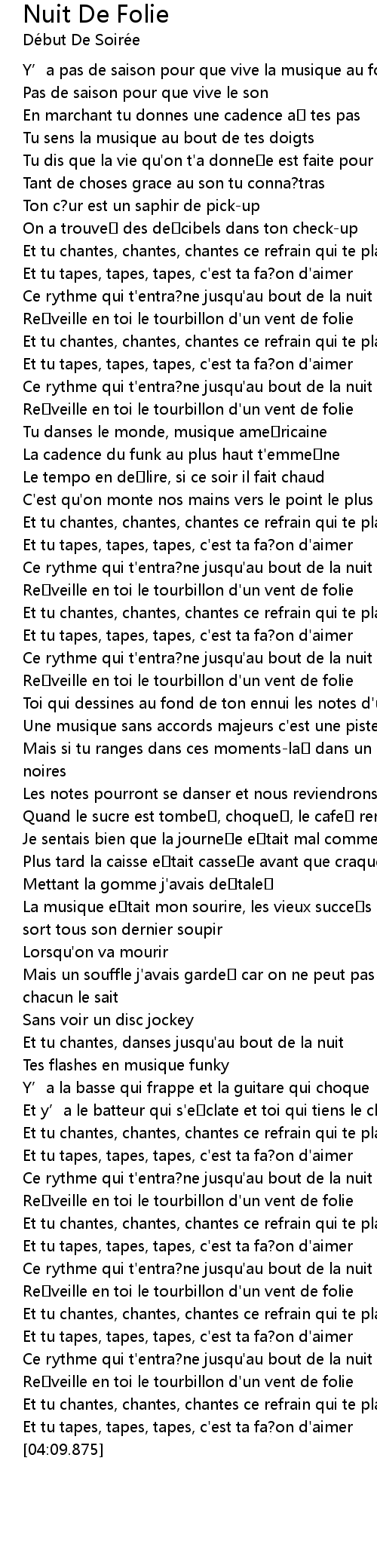 | [00:55.444] | Ce rythme qui t' entra? ne jusqu' au bout de la nuit |