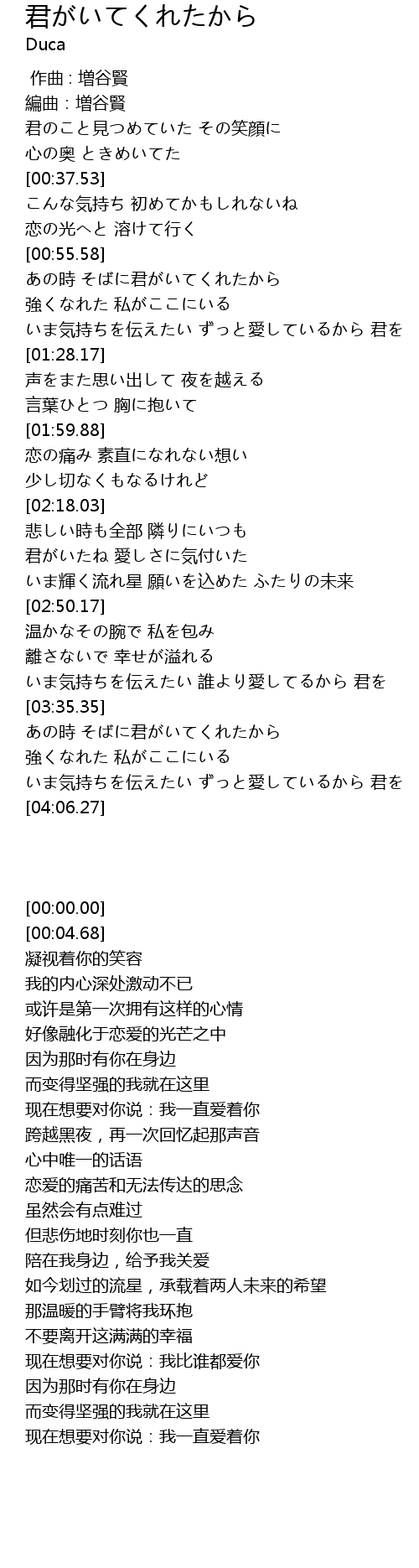 | [00:58.05] | あの時 そばに君がいてくれたから |